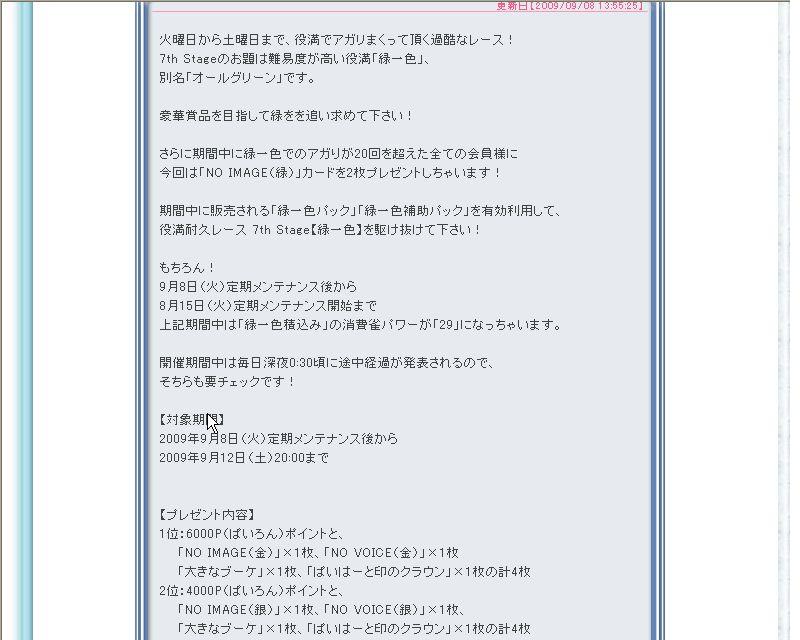 最近、というか甲子園が終わって以来 1ヶ月くらい学園のHPが更新されていないので、 すごく心配になってきている今日この頃。 教員も何名か行方不明になってたり、IN率激減してたり・・・。 学園がなくなったら、この新聞「生徒会新聞」じゃなくなるし!? あまりにも何も動きがなかったら、こっちが単独で 何か行動を起こすのも・・・悪くないですわね、ふふふ。 私が新学園を創設・・・なんて面倒なことはしそうにない ですけどね、たぶん・・・。 そもそも、この新聞自体もすたれてきてる・・・というか、 明らかにコメント数が減っているもので・・・。 自民党ばりの支持率低下が見えますわ・・・lllorz 八卦氏がよくコメントをくれていますが、それ抜きだと 何日コメントないのだろう、とかすごくネガティヴになってしまってますzzz 八卦氏に感謝するとともに、みなさんが思わずコメントで ツッコミをいれたくなるような楽しい新聞を書くよう、努力せねば ならないな・・・と思っています(_△_メ) さて、今日は久々のスクープ写真です。 なんとなーく公式のキャンペーン情報をみていたら、 こんなものを発見しました。 http://blog.cnobi.jp/v1/blog/user/736f9b15b04bf53aa4e5806674932d90/1252655091 キャンペーン期間は・・・9月8日から・・・ 8月15日まで、だと・・・! どういう時空になってるんでしょうね・・・(笑) テンパってるのか、⑨なのか知らないですが、 こういった悲しいミスはなくしてほしいものですね・・・。 今回はここまでです。次回も読んでくださいね~♪