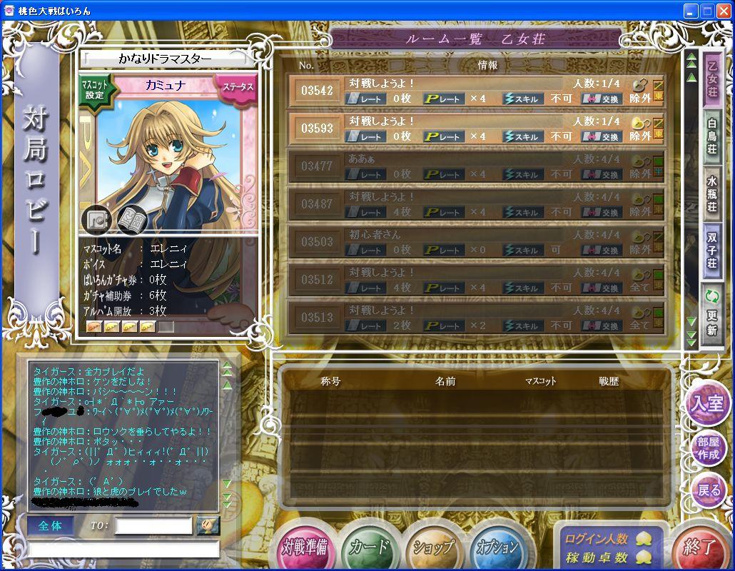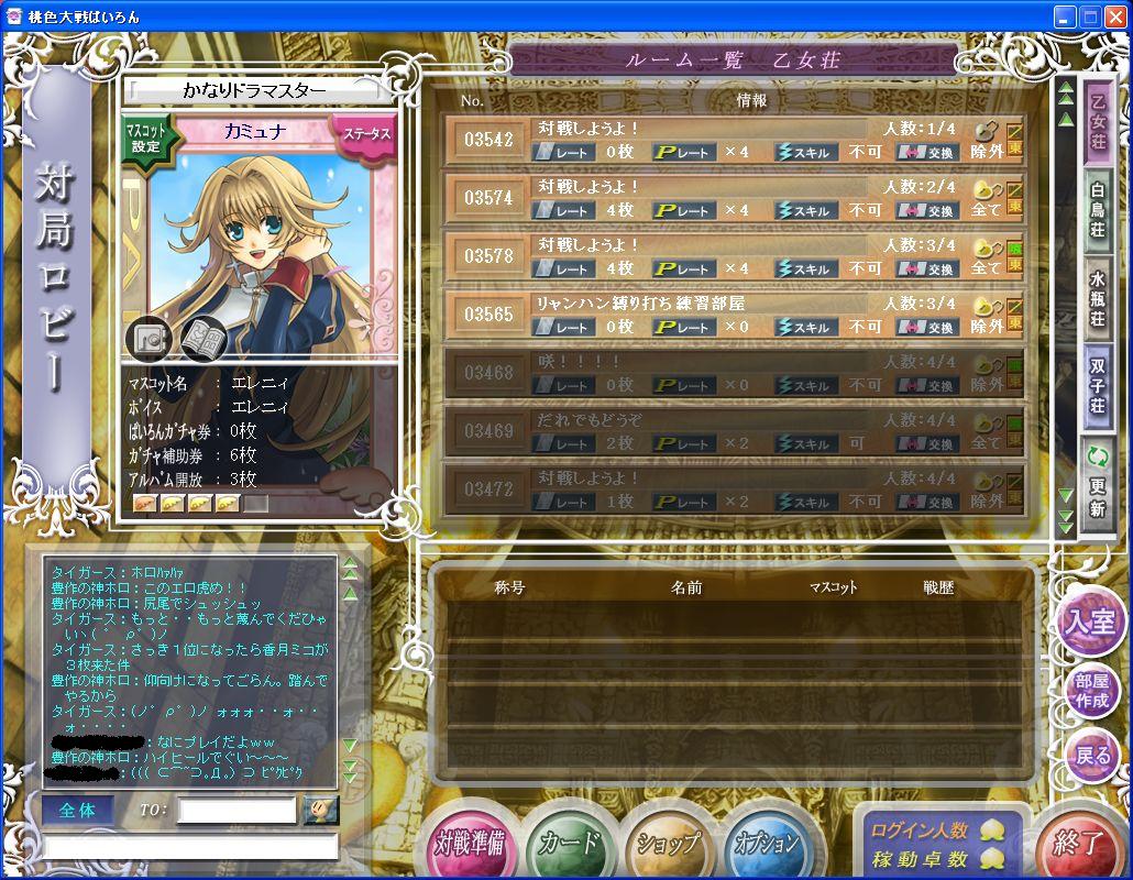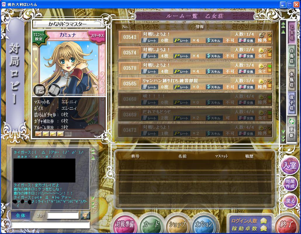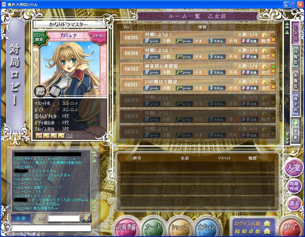 今回は、生徒会イベントのルールや、 最終結果の決め方を明記しようと思います。 部屋のルールについて 半荘・クイタン有り 対局中のチャットについて 対局中、コンビを組んだ相手との1:1は 基本的にOKとします。また、オープンで 雑談をしたりしてもかまいません。 極端な暴言や、心理作戦の枠をこえた 過激な発言などは禁止です。(常識的に スコアの報告について 対戦後の「+or-」を、全員分報告してください。 コンビ2人分足したものではなく、全員分を お願いします。(順位の決め方に関わります) 最終順位の決め方について 半荘2回分のコンビの合計で決めます。 (1回目+38と-11、2回目-15と-25 の場合、最終成績は-13となります) 同点が出た場合は、 一番でかいマイナスが軽いほうを 上位とします。 基本的に、このルールで行こうと思います。 ・・・このままだと、1~7位までしかないですけどね・・・。 本番まで10日ほどあるので、どんどんお友達を誘って エントリーしてくださいね♪ ・・・かなり切実だったりしますorz そこで、私はあるアイデアを思いつきました。 それは・・・ 当日、即席でコンビを組んで参加を したい、お一人様の参加も 受け付けます!! 「コンビ組みたい相手いない。誰でもいいけど探すの めんどい。友達がいない(さすがにないでしょうけど)。」 といったアナタも!同じ「一人でエントリー」した人と 当日いきなりコンビを組んで参加しちゃいましょう♪ 応募方法は、わたくしカミュナのほうへ 「1人エントリー希望」と伝えていただき、その際に 「~~日の~~と、~~日の~~に来れる」と、 来れる日時をお伝えください。 時間帯は、数日前の新聞に区分が書いてあるので、 それに沿って伝えていただけると助かります。 これを機会に、新たな出会いや発見がうまれるかも!? ・・・私、運営みたいなことやってるなぁ(汗) これ見た運営が、カードかなんかで給料くれないかなぁ(ぉぃ とまぁ、一人でも二人でも参加できるようになった、ということで・・・ めでたいことじゃ、ほっほっほ(誰 今回はここまでです。次回も読んでくださいね~♪ |