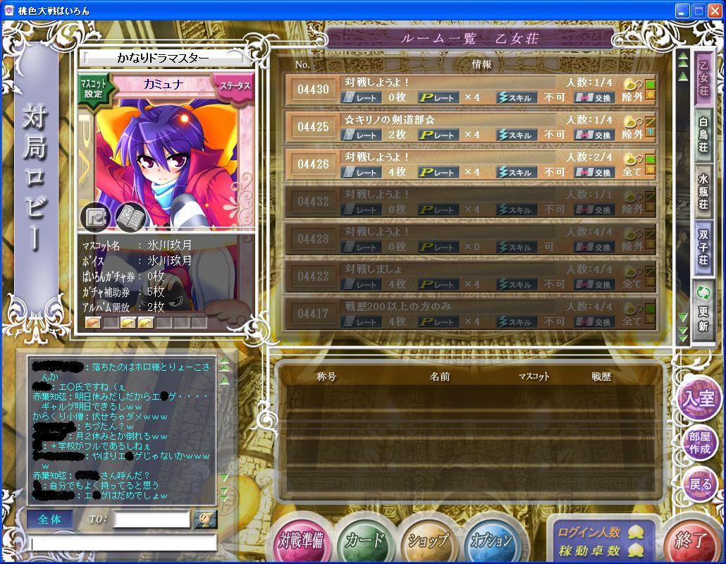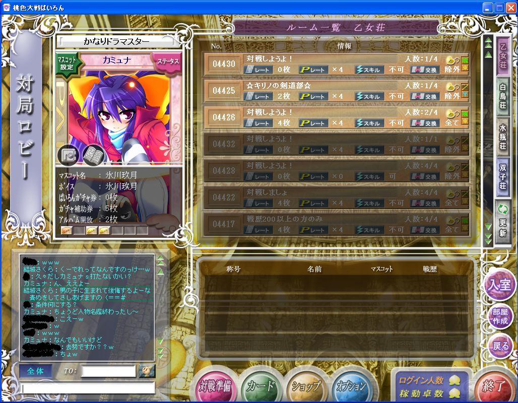 中間試験、最終日に一波乱あって、一部後日となりましたが、 とりあえず期間終了ですね。 5月も終わり、6月はカミュ杯と生徒会イベントが予定されています。 みなさん、いっぱい楽しみましょうね♪ さて、今回は大好評(?)の人物名鑑の最終巻です。 今回は「漢字で始まる人」です。 一部、スクープ画像つきで紹介しますので、 ゆっくりみていってね! 注意! ・この人物名鑑は、「カミュナが、ロビーでよく見る気がする」という 人たちについて、独断と偏見で選定・紹介をしたものです。 ・ここで紹介している内容が全てではありません。また、 信じるも信じないも、みなさん次第です。 ・あまり印象に残っていない人は、結構テキトーに書かれている 可能性がありますが、ご了承ください。作成者の記憶力には 限界があります。 ・「この人もよく見かけるのに、いないな」という人が出てくると 思いますが、作成者の友録と記憶とノリで書いたものなので、 後で優しく「この人は?」と教えてください。付け加えます。 羽:名前的によくハネそう。ウィング。飛びます。 葛葉キョウジ:playernameさんとよく楽天談義をする人。 機械魔さん:通称「ロボ子」。ロビー番をすることが多い。 ネジを1本でも取ると壊れるので注意。 結城さくら:おかしなお嬢様言葉を使う。超ドS。逆らうと サクラのパーフェクト拷問教室に連れて行かれる。 http://blog.cnobi.jp/v1/blog/user/736f9b15b04bf53aa4e5806674932d90/1243793782 http://blog.cnobi.jp/v1/blog/user/736f9b15b04bf53aa4e5806674932d90/1243793783 脅しが天下一品の自称ドM。 鷺:鷺氏→詐欺師。モネキャラを放出することによって、 自分を打ち負かすほど強い人を探している。 山田将軍:性・山田学園のトップ。時々大将軍になる。えちぃ 話題可。カミュナ=ラッキーアイテム、らしい。ガクブル。 森宮蒼乃:必ず最初は顔文字オンリーで挨拶をする人。 翠蓮:「すいれん」。たまに「翡翠」氏と見間違える。 青いトマト:まずそう。みなさんは熟すまで待ちましょう。 赤葉知弦:「あかばちづる」。りょーこ氏に「お姉ちゃん」と 慕われる。自他共に認めるギャルゲ好き。 http://blog.cnobi.jp/v1/blog/user/736f9b15b04bf53aa4e5806674932d90/1243793714 草薙昨日:ランク2位の人、振込み9%未満で、かなり 強いと評判。色々なゲームに手をだしている。 南:私も見たことがない、想像上の生き物。(_△_)が召喚。 よく投げられる。(_△_)=南、ではないので注意。 八卦:生徒会役員。当たるも八卦、当たらぬも(ry 芳乃さくら:ヨッシー。でっでいう。ダカーポのキャラ。 最近ほとんどニコニコ等へ出張。 豊作の神ホロ:自称狼。「ホ●」「●ロ」のように片方だけ 伏せるとやばい。赤葉氏同様、りょーこ氏に 「お姉ちゃん」と慕われる。エロ神。 無機化学:「無期懲役」とたまに呼ばれる。ムッキー。 無機物を召喚できるが、10グラム制限がある。 睦月咲:宮永ではないが、始めた時期的にかぶる。 優愛:「ゆめ」と読むらしい。最初読めなかった罠。 優美静秋香菜:「ゆうみせいあきかな」。学園の数学教師。 教員の中で一番マトモ。名字はたぶん「田中」。 幽離:「ゆうり」。名前だけ見るとなんとなく怖い。 「~ですの」といった喋り方をする。 嶺に咲く花:通称「花さん」。なんとなく高貴なイメージ。 緑森双葉:時々、p子ちゃんとロビーで不毛な勝負をする。 玲のん:よく、レアカードを放出してる人。 凰:「おおとり」ではない。「おう」氏。深夜中心にIN。 かなり考えて麻雀を打つつわものだが、時々ハマる。 翡翠:「ひすい」。ガッと掴んで質屋に持っていかないように。 深夜組では、とてつもなくまともな人。 霏憂:「ひゅう」。通称「ひゅー」。常に「みゅんみゅん♪」と 電波を発している。奴隷を数名所有。 とりあえず、こんなもんですかね。 「ロビーでよく見るけど、どんな人だろう」って いう人たちに、役立てば幸いです。 最後に、カミュ杯についてですが・・・。 緊急メンテやらなんやらで、枠が@3つ残りました。 そこで、予選を延長することに決めました。 まだ予選を通過していなくて、参加してみたいという方は 是非私に「予選マダー?」と挑戦してください♪ 今回はここまでです。次回も読んでくださいね♪