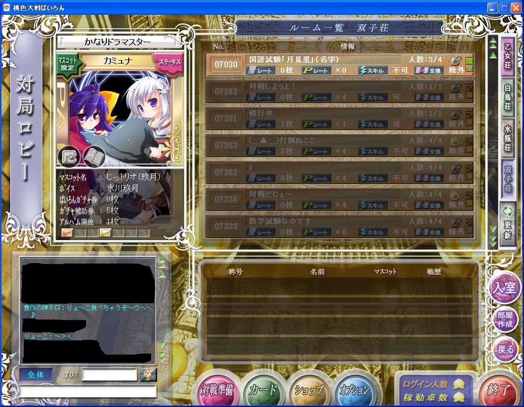 今日はレアモンスター(?)な教師も来て、 試験が盛り上がっていましたね。 今日は、残りの先生の試験について考察などをしたいと思います。 まずは・・・非公開のからくり先生の試験について。 非公開で他言無用なので、内容は言えませんが・・・。 他の先生の試験よりは比較的簡単だけど、 なるべく自分の運がいい日を選ぼう!! まぁ、どの試験でも言えることですが・・・(笑) 次に、あすたん先生の試験について。 振込みをしなければいけない、という性質上、 あすたん先生の調子が悪いと逆に難しい、という 他の先生とは違った要素のある試験ですね。 大事なことは2つ。 1.当たり牌を読もう! 当たり牌をどれだけ絞れるかが大事ですね。 先生の捨て牌だけでなく、自分の手牌と他家の捨て牌を見て、 牌の数を計算することまで重要になってきます。 たとえば、あすたん先生がしょっぱなから7mを捨てていて、その後で 手出しで字牌をきったり、マンズを適度にきっていったとしたら・・・ マンズの上のほうは、さっさと捨ててしまいましょう。 当たらない牌もってても意味ないですしね。 最初のほうは、あすたん先生の捨てる現物を中心に捨て、 どんな時にどんなリーチをされてる振れるように準備しましょう。 また、自分が親の時は、テンパイ狙いも忘れずに。 あすたん先生がテンパイできず流れたら悲しいですよ(笑) 2.上家は協力しよう! 実は、こっちのほうが大事という意見もあるとかないとか。 あすたん先生だって人間です。時々酔っ払いです。 自力テンパイできないことだって多々あります。 そんな時に有効なのが、「クイタンあり」のルールを利用して あすたん先生に有効牌をプレゼントしましょう。 試験がスムーズに進みます。先生の上家になったら、先生を テンパイに導くという役目も忘れずに! あと一人いたな・・・面倒なのでここまで! 次回も読んでくださいね~♪ あ、あと・・・私主催の大会の予選、どんどん受けにきてくださいね>w< |